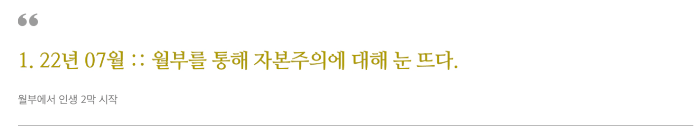 이후 아이케어에 집중하고 싶다는 마음이 커서 월부 들어와서 처음으로 강의를 쉬게 됩니다. 정말 처음에는 월부를 하지 않는다는 것이 너무나도 어색하고 시간이 너무 많이 남아서 어떻게 해야 할지도 몰랐습니다. 하지만 이 시간을 온전히 아이케어하는데 쏟아 부을 수 있었고 이 선택 역시 돌이켜 보니 잘했다는 생각이 듭니다. 당연히 다른 동료분들이 몰입하고 성과를 낼 때 저는 육아를 하고 있었지만 후회하지 않습니다. 아이와의 이러한 시간이 돌아오지 않는다는 것을 알고 있었기에 그 시간을 즐길 수 있었습니다. 당연히 피곤하고 몸은 힘들었지만 너무나도 행복했습니다. 그리고 아이를 함께 케어하면서 와이프와의 관계도 이전보다 더 좋아졌습니다.