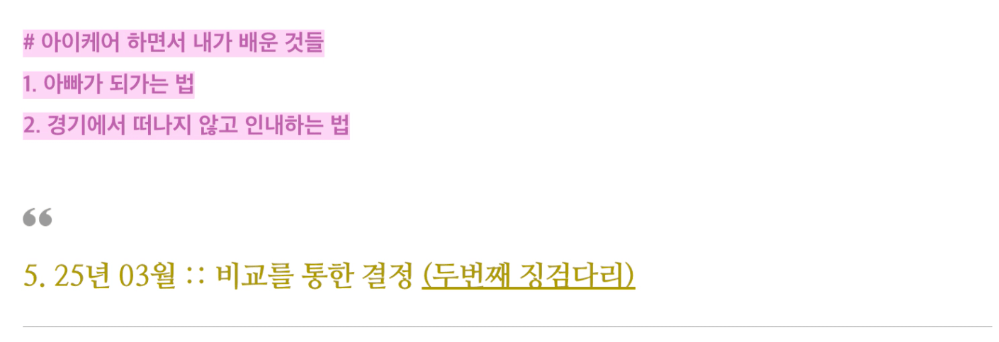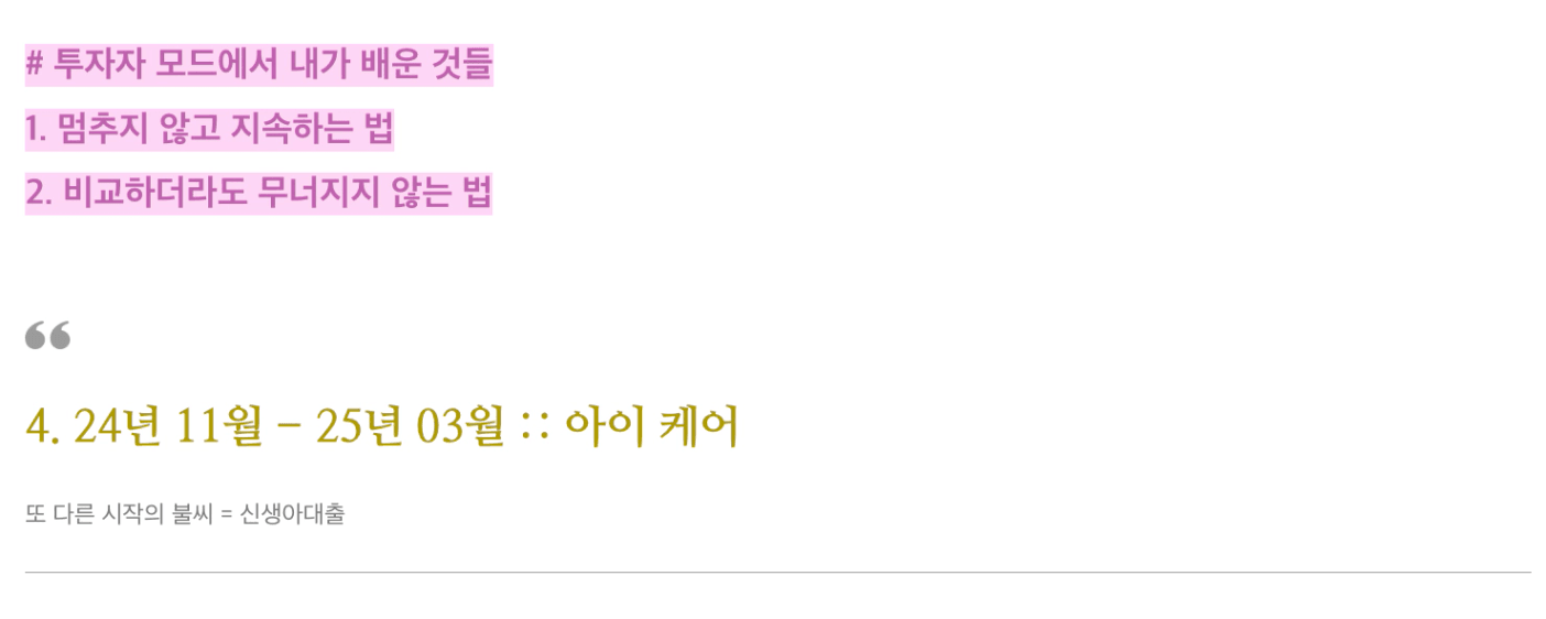 정말 감사하게도 22년 08월에 마련한 내집에 거주하면서 거주만족도가 높았고 월부 생활 역시 지속해 나갈 수 있었습니다. 그러는 와중 저희 부부에게 귀한 손님(우리)이 찾아오게 되었고 24년 11월 아이를 출산하게 됩니다. 제 히스토리를 아시는 동료분들도 있지만 아이가 태어나기까지 쉽지 않은 시간이였지만 결국 원하는걸 포기 하지 않으니 이루어지더라구요^^모두들 포기하지 마세요!!!