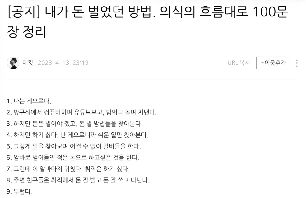 [출처] 내가 돈 벌었던 방법. 의식의 흐름대로 100문장 정리ㅣ작성자 메킷 |