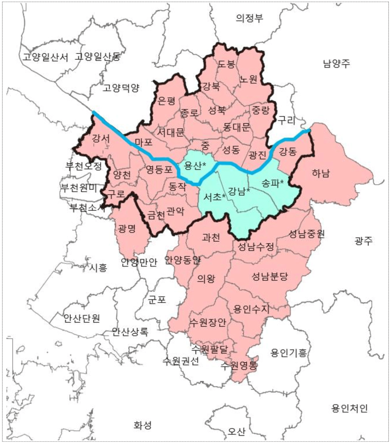 • 서울: 4개구(강남구, 서초구, 송파구, 용산구)