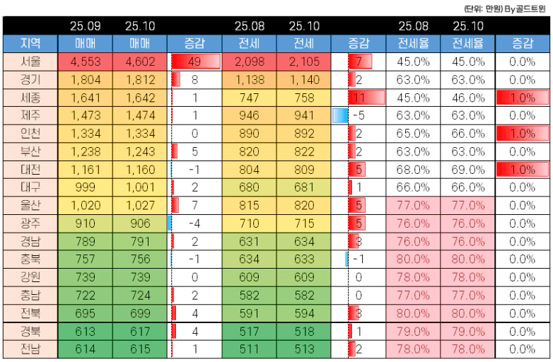 * 서울, 세종, 대전, 울산, 광주 큰 폭 상승