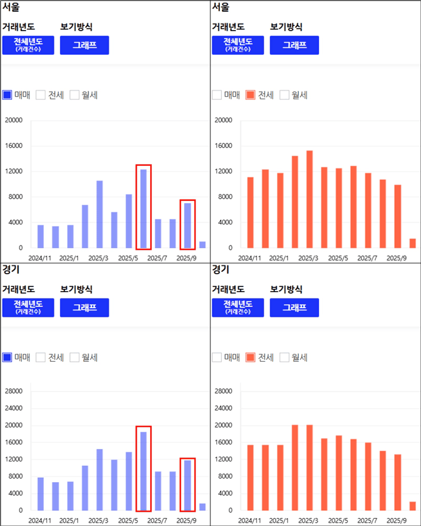 서울/경기 매매 거래량이 늘은 모습을 볼 수 있습니다.