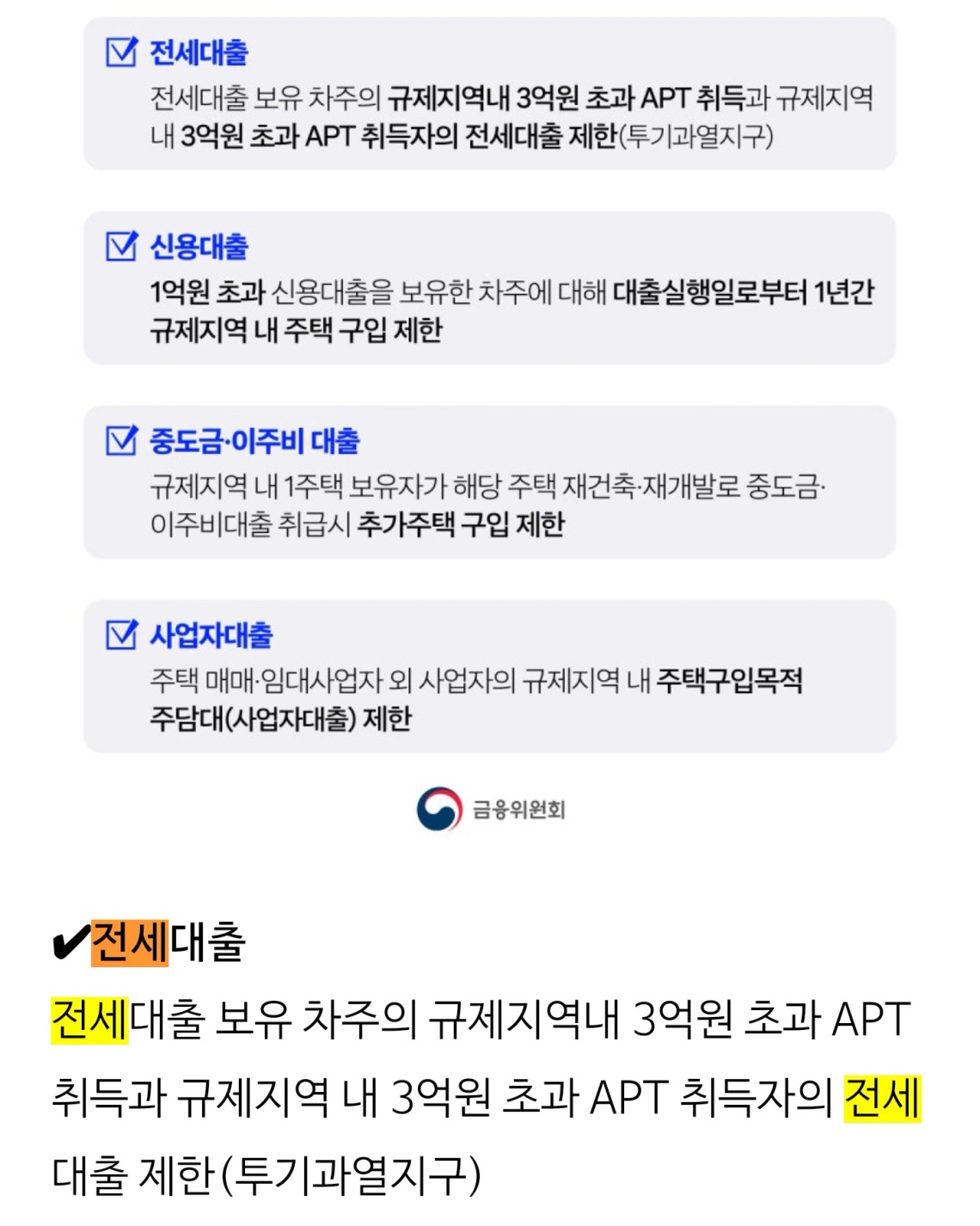 전세대출 보유자가 이번 규제지역에서 3억 초과 아파트를 매수할 경우 기존 전세대출이 회수되며 규제지역에서 3억 넘는 아파트를 취득한 사람의 전세대출 또한 제한된다고 합니다. (배우자 포함)