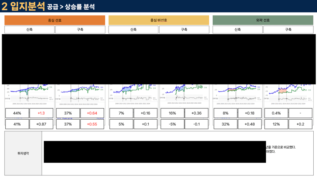 중심지의 선호하는 신축/구축, 중심의 비선호 신축/구축, 외곽의 선호하는 신축/구축