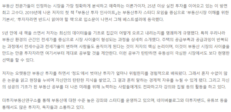 임보를 쓰면서 알고 있다고 생각했던 공급에 대한 기준점과 월세 수요의 의미와 전환되는 이유에 대해서 바로 잡을 수 있었다. 막연하게 이제 '한다'보다는 '알고한다'로 넘겨야 한다고 느끼게 되었다. 데이터로 보았던 부분들의 본질을 배울 수 있었던 책이라 한번 더 재독하고 스스로 적용까지 이어야겠다.
