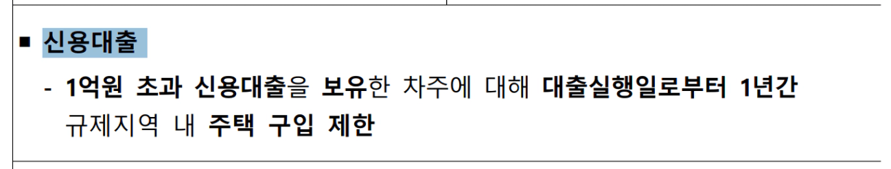 1억원 초과 신용대출 보유 시 1년간 규제 지역 내의 주택 구입이 제한된다는