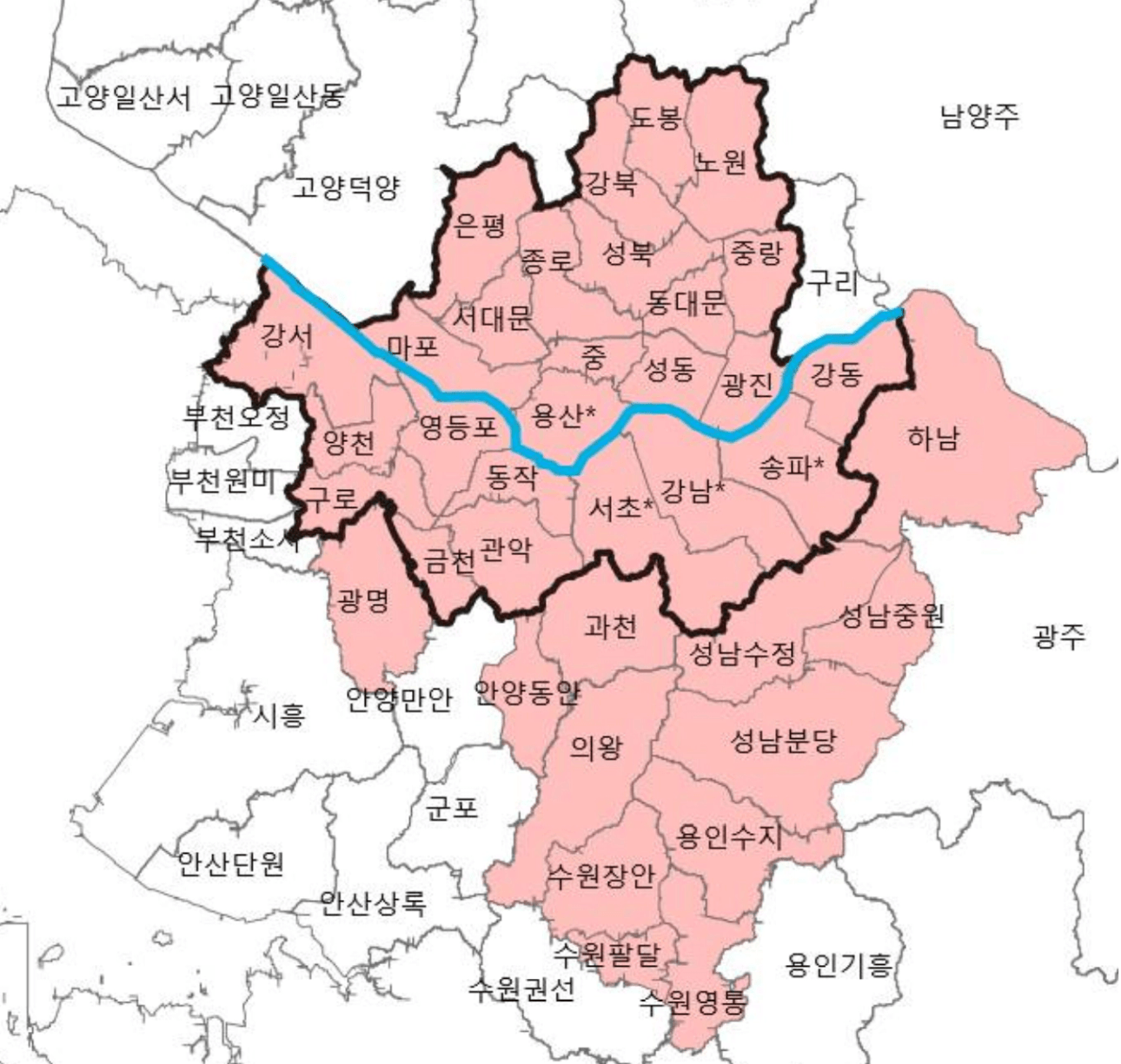 서울 전역과 경기 12곳(과천, 광명, 성남(분당·수정·중원), 수원(영통·장안·팔달), 안양동안, 의왕, 하남, 용인수지)까지