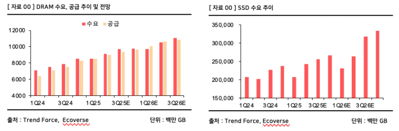 HBM은 AI 가속기 내에서 데이터를 빠르게 전송·처리하기 위한 핵심 메모리로, 초당 수백 GB에 달하는 대역폭을 제공해 모델 학습 및 추론 속도를 결정짓는 주요 요소로 작용한다. 반면 NAND는 학습 및 추론 과정에서 생성·저장도는 대규모 파라미터, 가중치, 데이터셋을 장기 보관하는 역할을 담당한다. 선술하였듯, 추론용 AI 반도체 칩 생산이 급증하고 있는 현 시점에서 AI 가속기의 구조적 특성상 HBM과 NAND 모두 수요가 집중될 수밖에 없는 환경이 조성되고 있다.