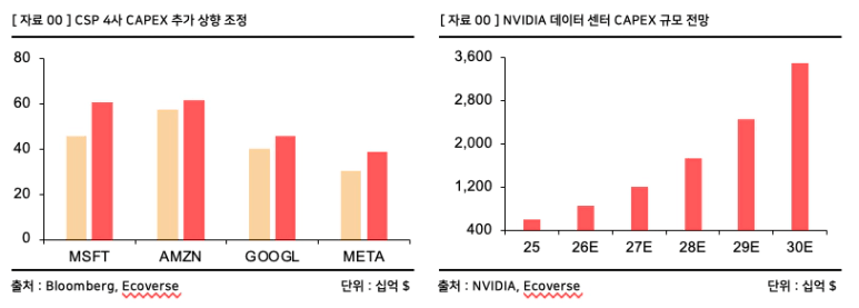 주요 AI CSP 4사(Microsoft, Amazon, Alphabet, Meta)는 25년 기존 가이던스를 잇따라 상향하며, 2H25 CAPEX 규모는 총 2,060억 달러에 이를 것으로 추정된다. 또한 엔비디아는 또한 엔비디아는 25년 10월, 데이터 센터 CAPEX 투자규모를 약 6,000억 달러로 발표하였으며, 30년까지 3~4조 달러까지 늘릴 것으로 발표했다. 이는 AI산업이 Generative AI에서 Agentic AI로 접어들면서 주도권을 확보하기 위한 움직임에 기인한다.