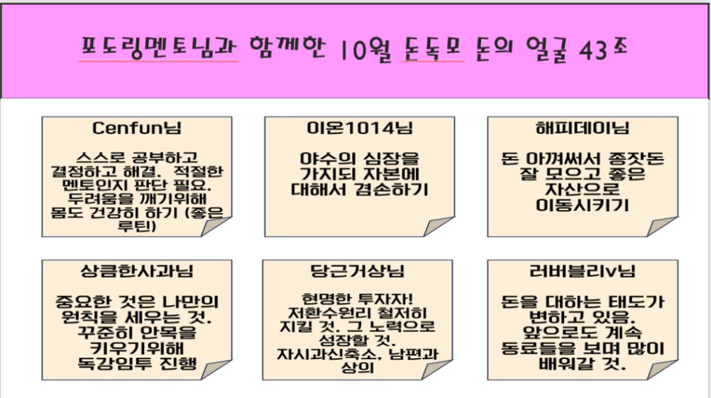 이번 돈독모 책인 ‘돈의 얼굴’은 EBS 책이라 자본주의 및 돈에 대한 포괄적이고 교육적인 내용을 담고 있어서 이해하기 쉬웠습니다. 이번 돈독모 진행자이신 포도링 튜터님 및 열정적인 조원들과 책에 대해서도 다양한 이야기를 나눌 수 있어서 좋았습니다.