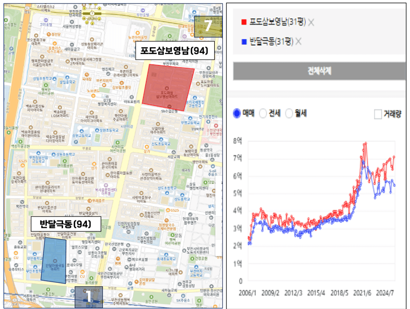 1호선과 가까운 반달극동 보다 포도삼보영남의 가격이 더 높게 오릅니다.