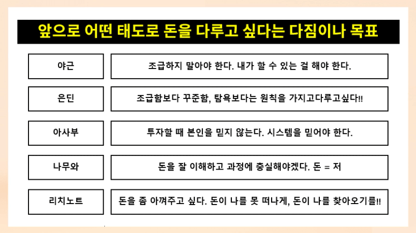 돈에 관련된 내용이라고 해서 발제문이 너무 딱딱하지 않고, 내가 체감했던 물가 상승은?처럼 비교적 가벼운 이야기들로 구성되어있었고, 같은 책을 읽어도 각자의 경험이 달랐기 때문에 다양한 사례와 책의 내용을 접목하면서 이야기를 나눌 수 있어서 즐거웠습니다.