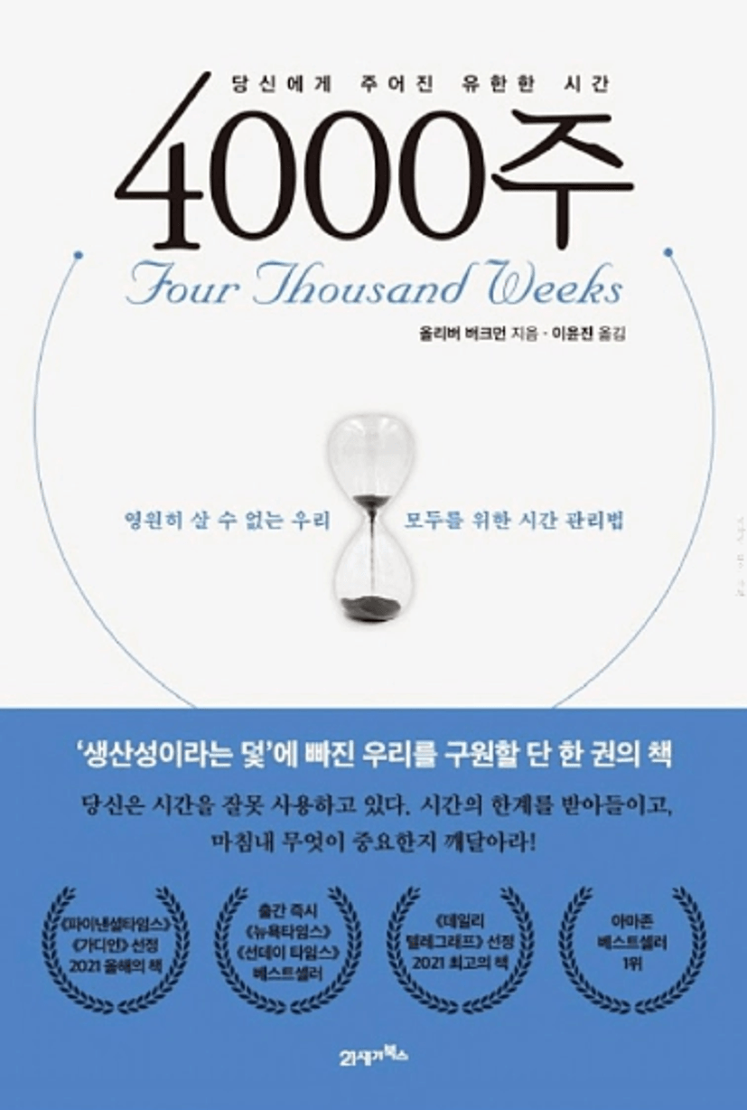 바쁘다바빠 현대사회가 왜 생겨났는지 굉장히 탄탄한 논리를 통해 원인을 알려주고, 이를 극복할 다양한 사고방식와 실천방법도 알려주어서 유익했다. 책 제목인 4000주는 우리 인생이 80세라고 했을때 주어지는 시간이다. 누구나 태어났으면 죽는 것인데 사람들은 내가 죽는다는 사실을 매일 잊고 산다. 내가 보내는 1주, 인생의 전체 4000주 중에 1주이며 살면 살수록 줄어든다는 것을, 한계치가 있다는 것을 계속 기억한다면 우리는 좀 더 하루를 소중하게 여길 수 있을 것이다.