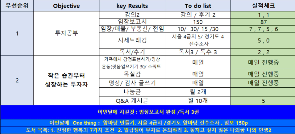 - 독서: 진정한 행복의 7가지 책을 읽으며 더 나은 행복을 알아 같고 월급쟁이부자로 은퇴하라 책을 읽으며 부동산투자 방법과 태도를 배웠습니다.