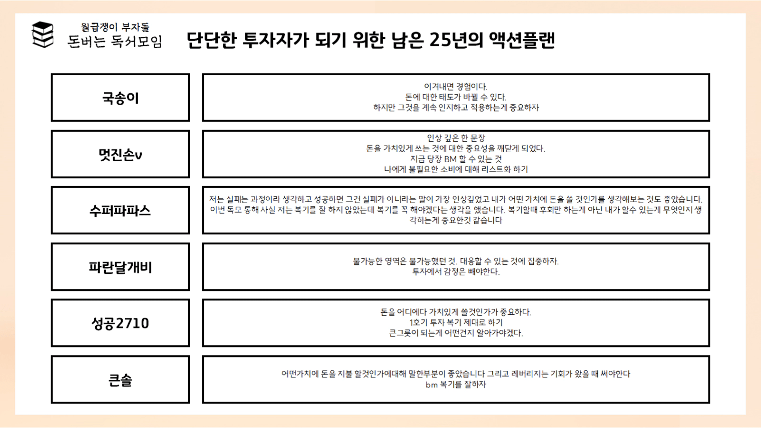 # 논의 주제 3. 책 내용 중 벤치마킹할 내용과 어떤 태도로 돈을 다루고 싶은지에 대한 다짐/목표
