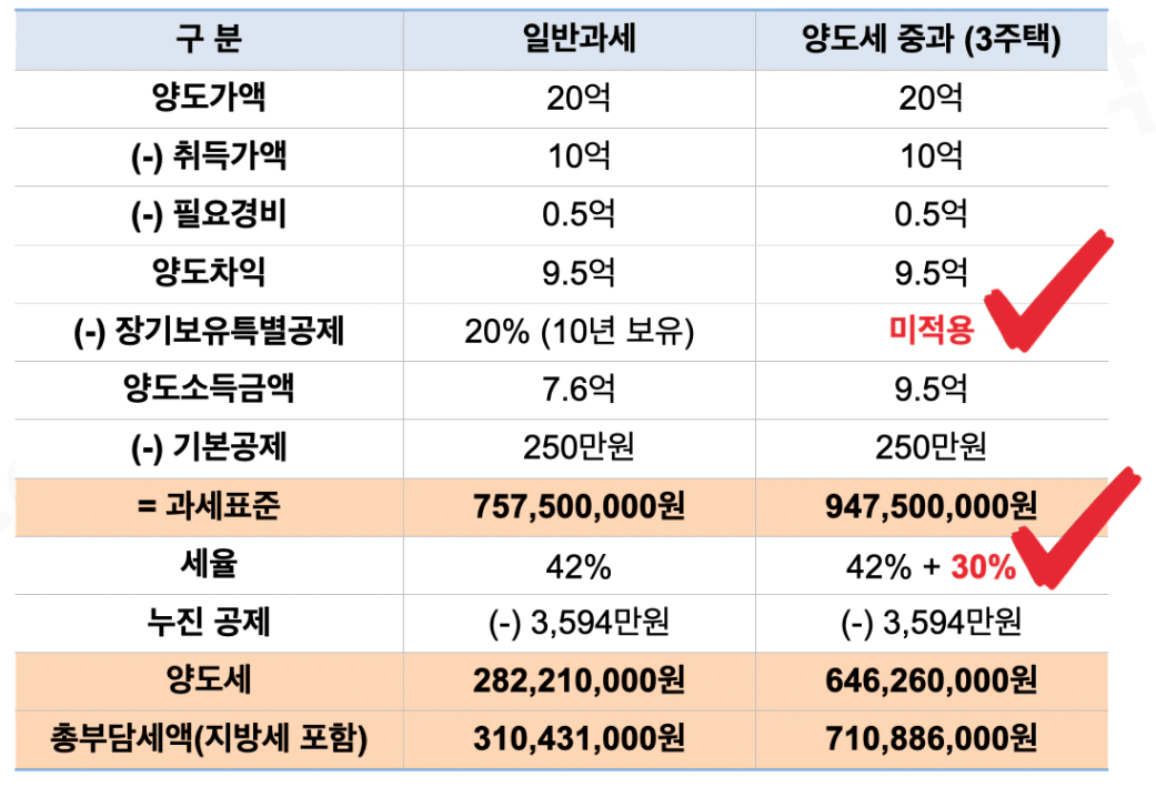 보시는 것처럼 취득가 10억, 양도가 20억, 필요경비 0.5억, 10년 보유, 단독명의일 때 일반과세는 약 3.1억 원 양도세가 나오지만 3주택 중과 적용시 7.1억 원으로 무려 4억 원을 더 부담해야 합니다. 다만 26.5.9까지는 양도세 중과를 한시적으로 유예 중이니 만약 매각을 한다면 그 전에 매각, 아니면 계속 보유할지 혹은 증여 등을 할지 결정해야 합니다.