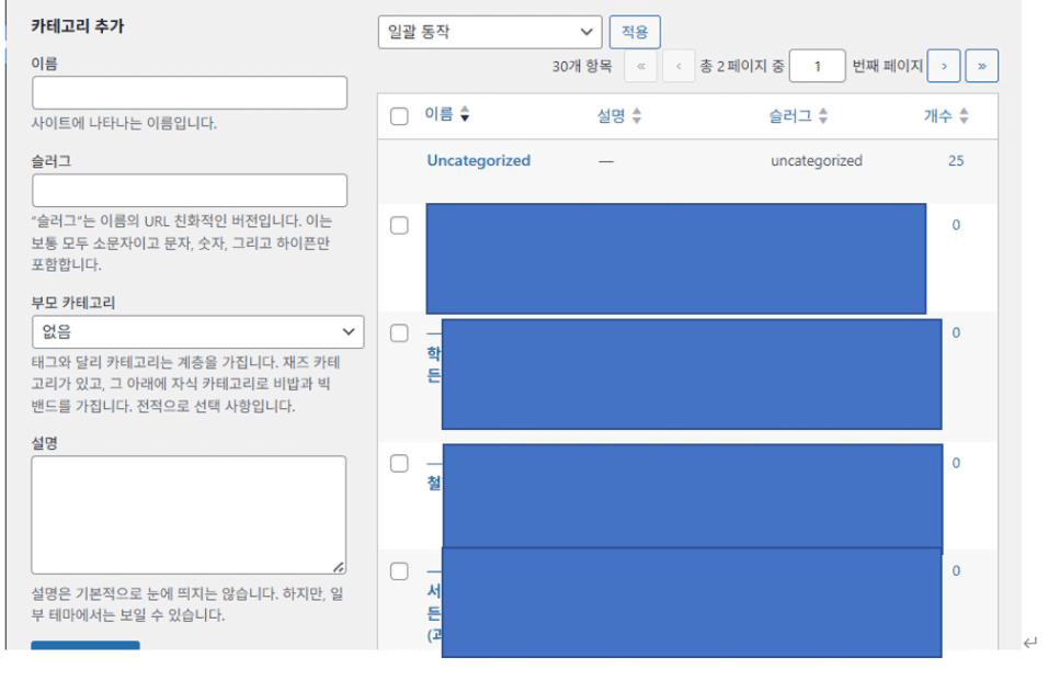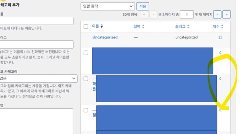 카테고리를 모두 지우기 전에 사이트에서 조회가 되던 글들은 ‘개수’ 부분에 숫자 1이라고 표시되었고, 글> 모두보기에서도 카테고리명이 명시가 되었는데 지금은 모두 uncategorized라고 되어있어요.ㅠㅠ