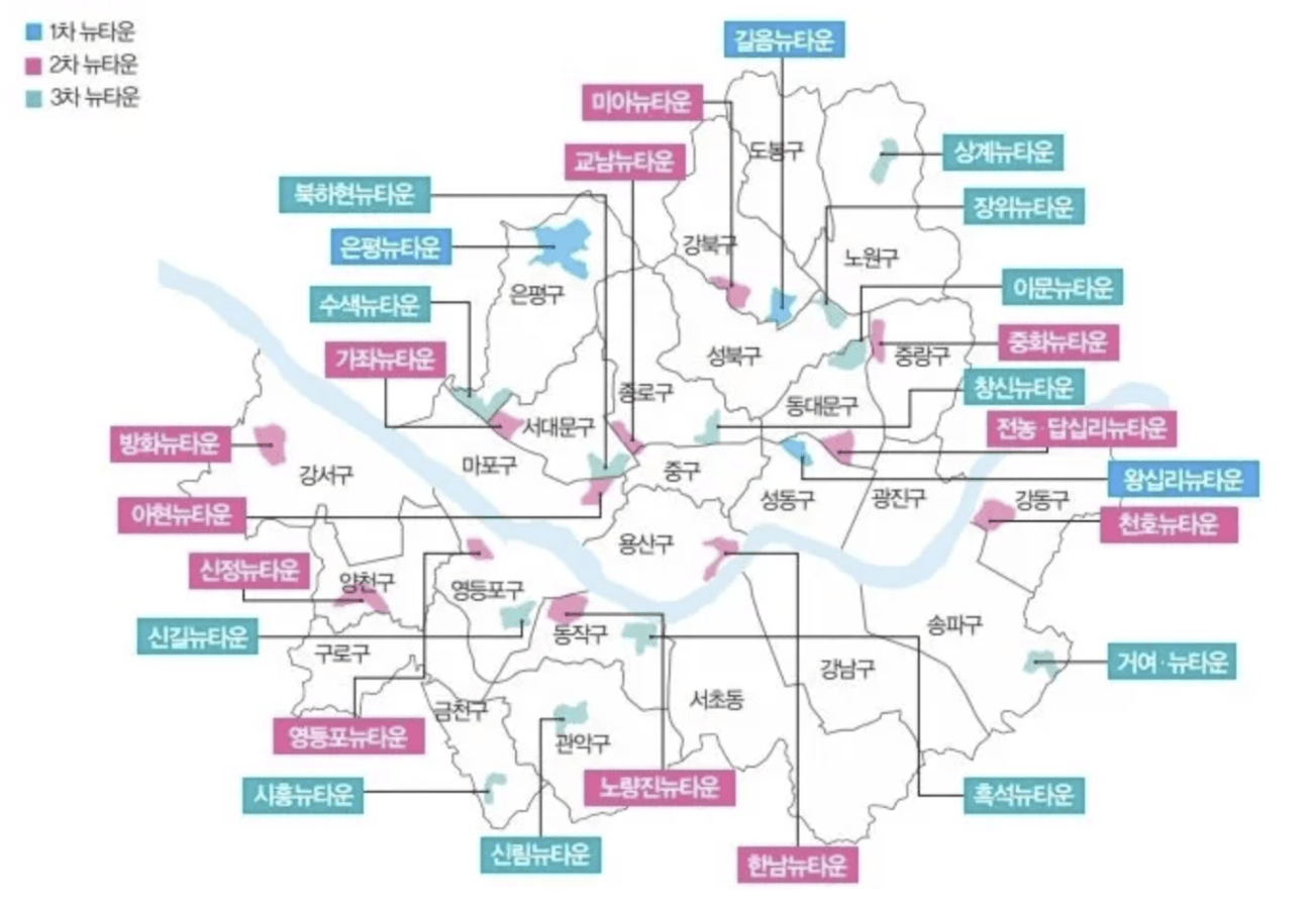 즉, 뉴타운은 넓은 지역을 재개발하여 일부 지역만 새 것이 되는 것이 아니라 주택가들과 주변의 기반 시설까지 모두 깔끔하게 구획을 정리해서 쾌적한 주거환경을 누릴 수 있도록 완전히 새로운 도시 (New town)을 만드는 것으로 생각해주시면 좋을 것 같습니다.