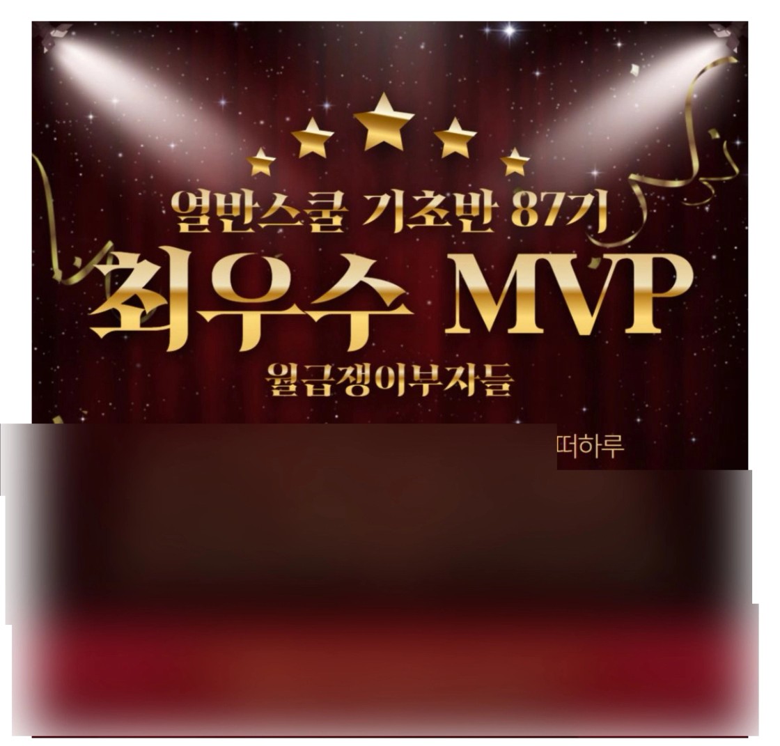 강의 1개만 딱 도전해보자!! 하고 열반기초반을 듣게 되고 너바나님의 오프강의에 초대되어 강의를 듣고 충격에 벗어나오지 못했습니다. 열기의 강의가 이걸로 나도 인생을 바꿔야겠다라는 터닝포인트가 되었고, 첫 강의에서 좋은 동료들을 만나 많은 도움을 받고 MVP에 선정되었습니다. (그렇게 강제로 월부에 멱살잡혀 강의를 매달 듣게 되는 상황이 되어버렸죠..ㅎㅎㅎ;;)