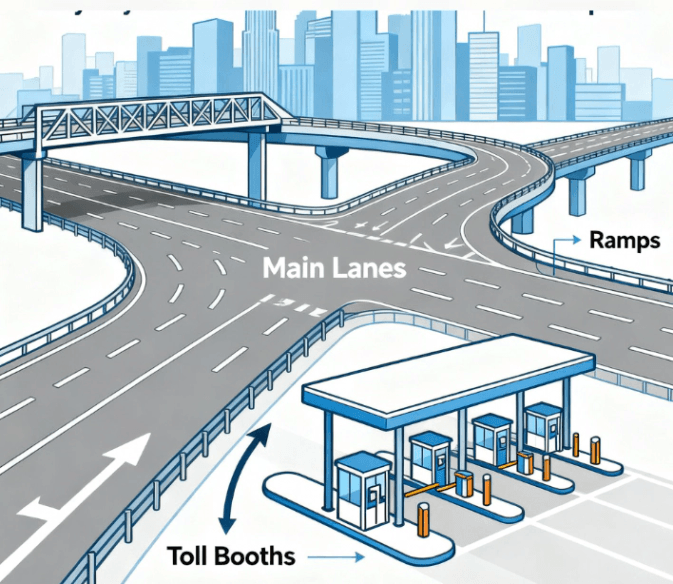 설계 구조 | 신호·건널목 없음, 입체교차로(나들목)만 허용 | 신호·건널목 없음, 나들목 설치 유연, 기존 도로 위 고가·지하·하천 유역 등 다양한 축건 방식 |