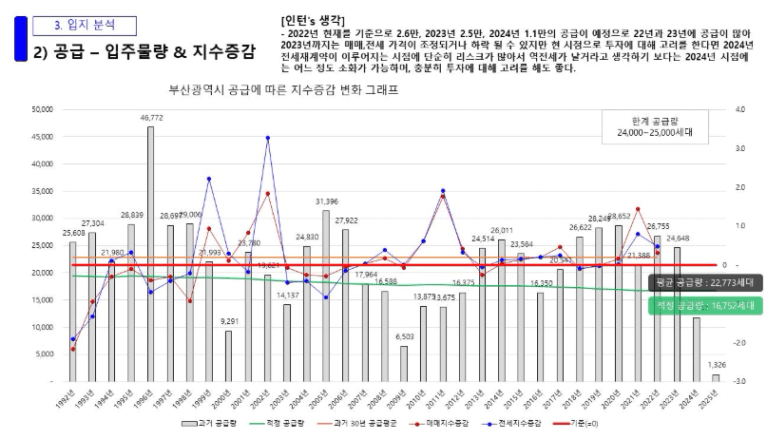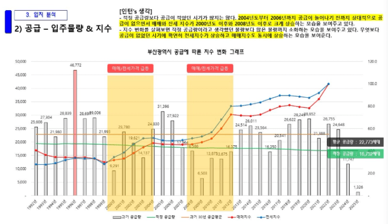 1. 부산 시장의 경우 적정 공급량보다 공급이 적었던 시기가 많지는 않다는 것을 확인할 수 있습니다.
