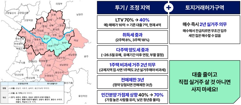 👨🏻 말 그대로 예전보다 돈 빌리기도 어렵고 투자 목적으로는 집을 매수할 수 없게 만든 대책이야. 조정지역뿐만 아니라 토허구역까지 묶어서 매수 즉시 2년동안 실거주를 해야하는데, 지금처럼 전세나 월세가 낀 물건들에는 미리 매수할 수 없는 상태지.