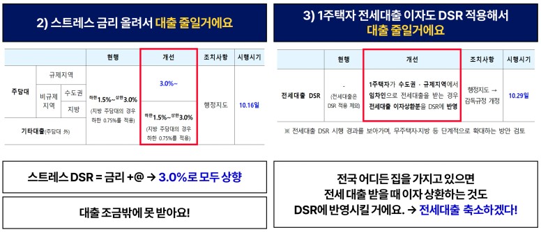 👨🏻 대출을 받으려는 사람도, 대출을 해주는 은행에 있어서도 대출을 축소한다는 내용이야. 주택이 1개라도 있으면 타 지역에 실거주하기 위해 전세대출을 받을 때도 상환하는 이자까지 DSR까지 잡히니 상대적으로 전세대출도 축소하겠다는 거지. 돈 줄을 줄이겠다는 목적이야. 결국은 전반적으로 대출 수요도 금융규제를 통해서 과열된 시장을 잡겠다는 의도인거지.
