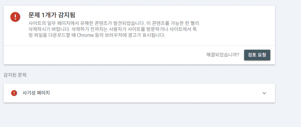 2. 구글 서치 콘솔 개요에 보안문제 1개 감지됨으로 나타나는 부분