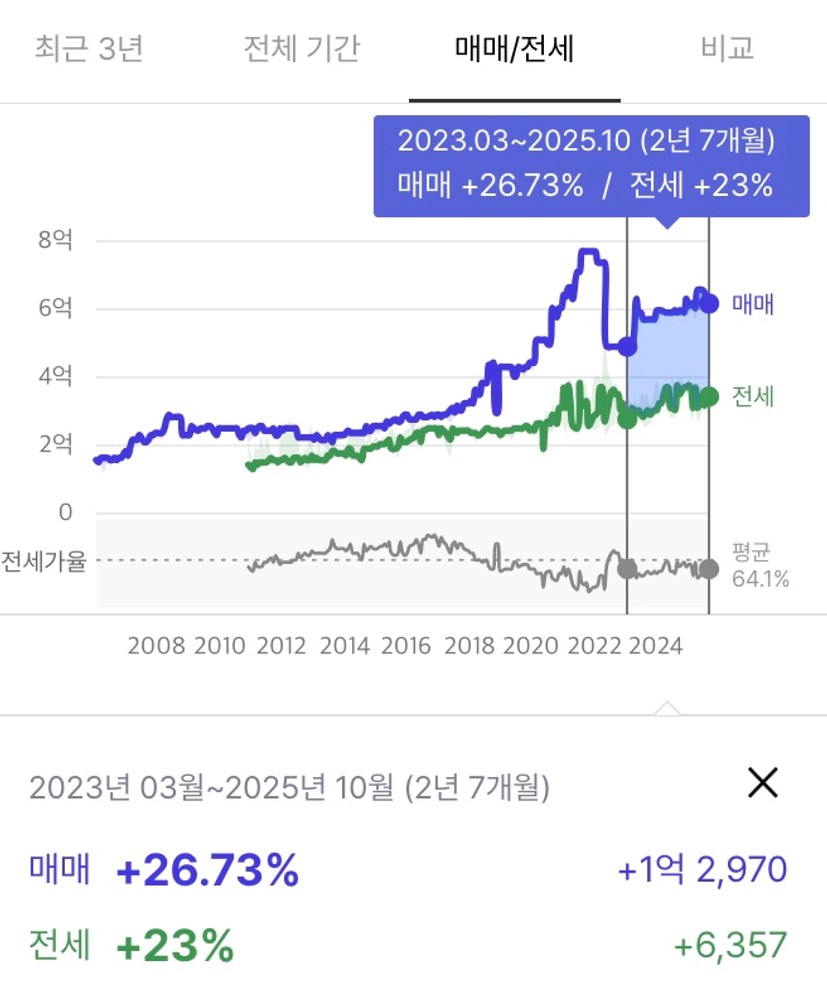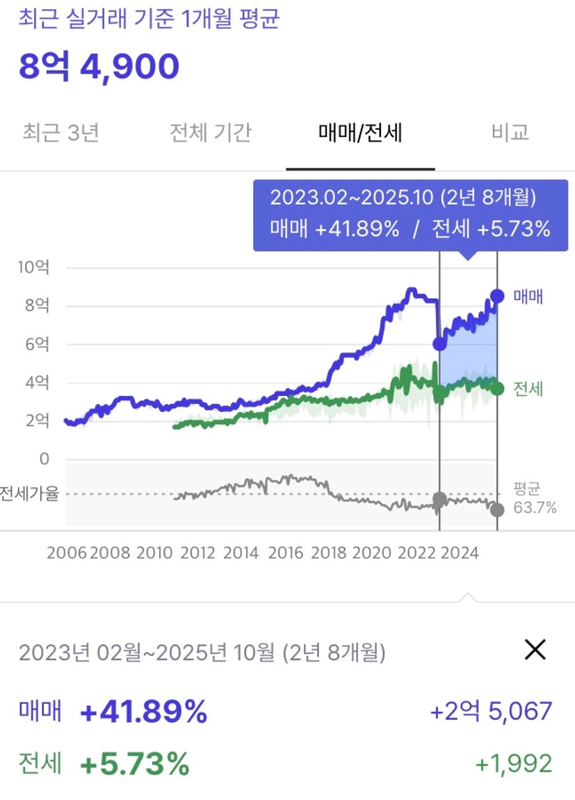 2023년 3월 처음으로 내집마련을 하기 위해 시작했던 공부, 지금 생각하면 선호도가 많이 떨어지는 구축의 소형 22평인데도 2년 7개월동안 1억이 26%나 상승했다. 하지만 그 때 당시 나에게는 영끌이었다. 아직도 난 저축보다도 계속해서 한 달에 월급의 반 이상을 이자로 감당하고 있을 것이다. 다행인 건 그 당시 같은 투자금으로 할 수 있던 이 단지는 2배 이상 벌었을 것. 이렇게 진짜 투자에 대해 깊이 공부하고 가치를 판단할 수 있는 방법을 배운 것 자체로 너무 만족하고 있다. 이미 2년 사이 자산은 2배가 되었다.