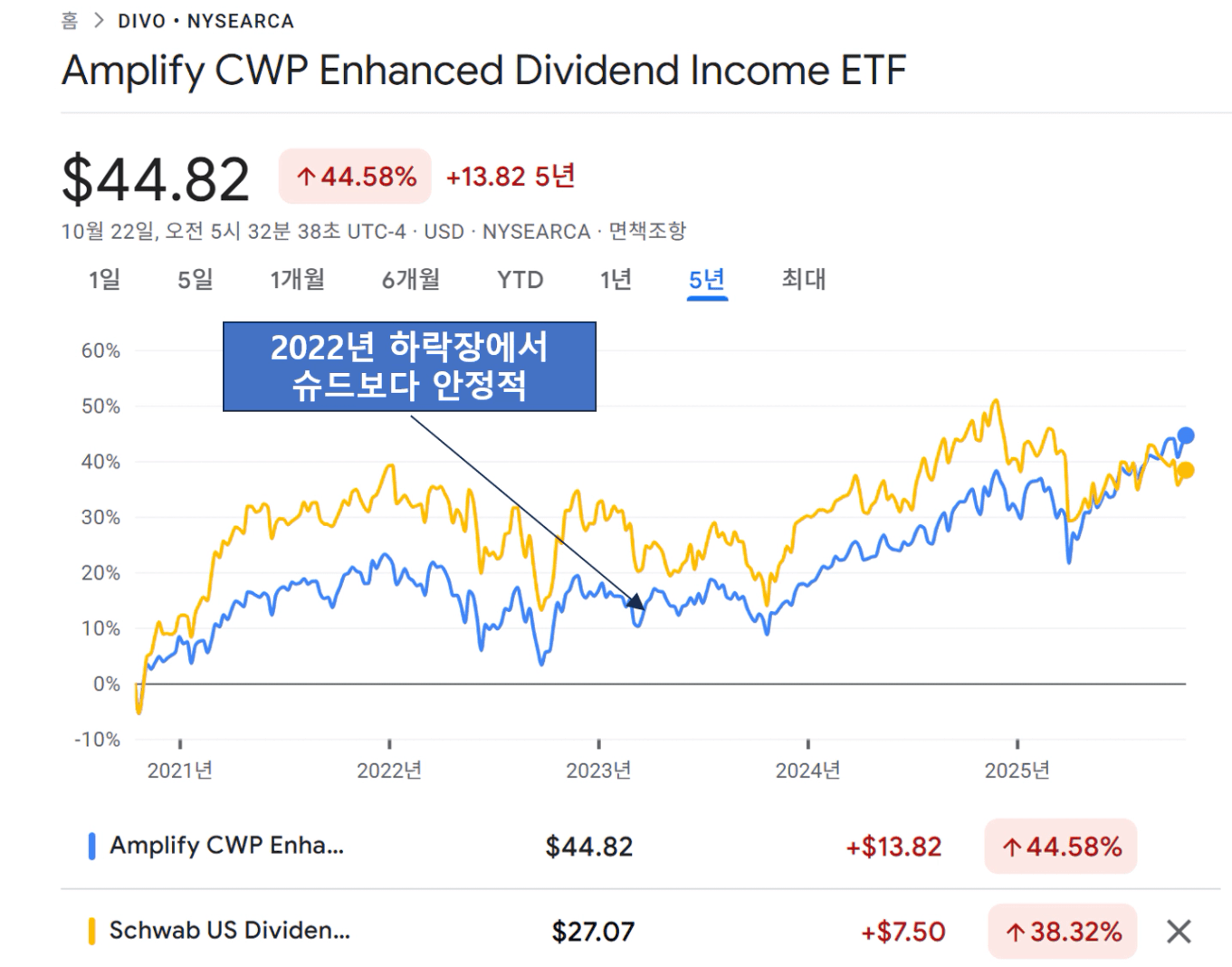 1년간 주가 비교로는 미흡하니, 주가 비교 기간을 5년으로 늘려서, DIVO와 SCHD 주가 비교를 해봅니다. DIVO는 5년간 44.6% 상승, SCHD는 5년간 38.2% 상승하여, 장기적으로도 DIVO 주가 상승률이 슈드보다 좋았습니다.