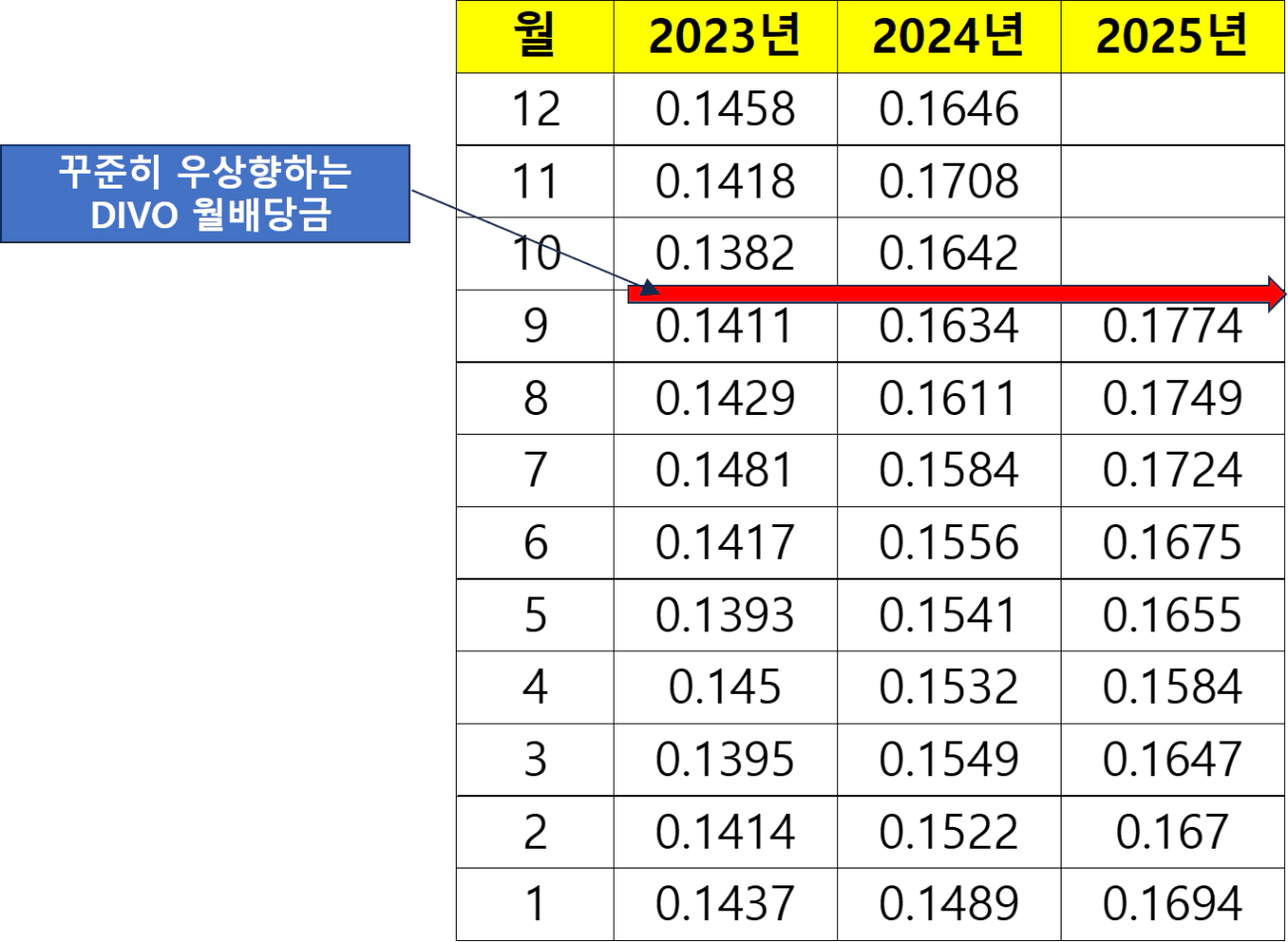 DIVO은 3년간 배당금 증가 추세를 보아도 꾸준하게 증가하고 있습니다. 2021년 부터 평온은 DIVO에 투자를 시작했는데, 당시에 배당성장률이 10%가 넘었습니다. 다만 2022년 하락장에 배당성장이 멈췄다가, 23년부터 다시 배당성장을 하고 있습니다.