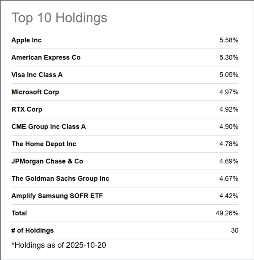 DIVO ETF는 배당을 지급하는 미국 대형우량주 30개에 집중 투자하고 있습니다. 상위 10종목을 보면, 애플과 마이크로소프트, 아메리칸 익스프레스와 비자카드, 미국 방산기업 RTX, CME 거래소, 홈디포, JP모건, 모건스탠리 등 미국의 우량 대형주에 투자하고 있습니다.