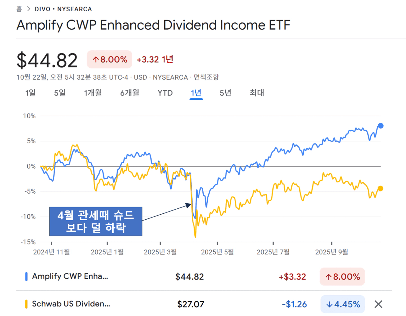 또한 올해 4월 트럼프 관세로 주식시장이 발작을 일으켰을 때도, 슈드보다 덜 하락하였습니다. 즉 DIVO는 슈드보다 덜 하락하고 더 상승하고, 게다가 배당도 더 주는 월배당 ETF입니다.