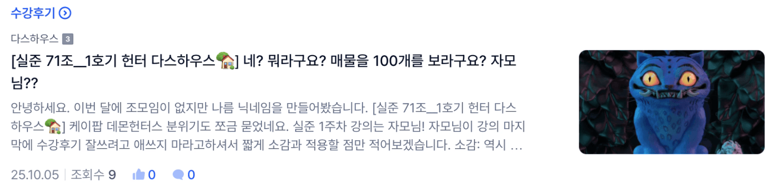 안녕하세요 1호기 헌터 다스하우스입니다.