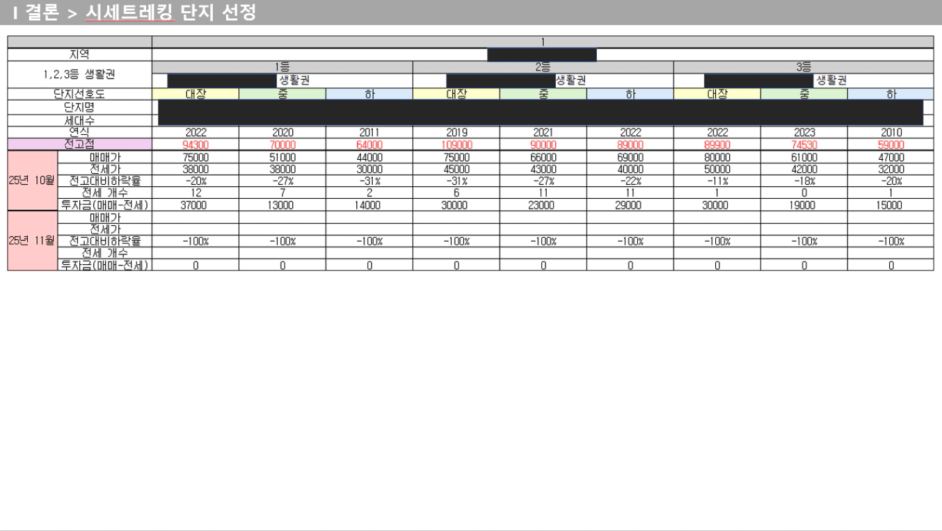 앞마당 1개당 가장 좋은 생활권 상중하 단지 총 3개-하루 3분-단지별로 3개 항목만 입력(매매/전세/전고대비하락률)