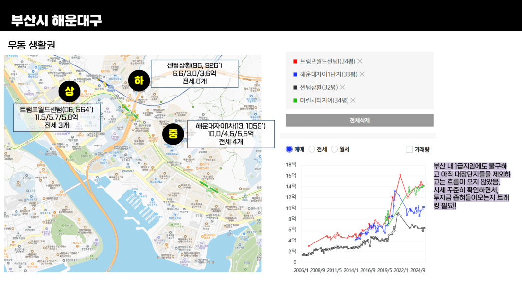 • 대표단지/매물적체량/부동산분위기/공급단지목록/시장종합판단 등 확인