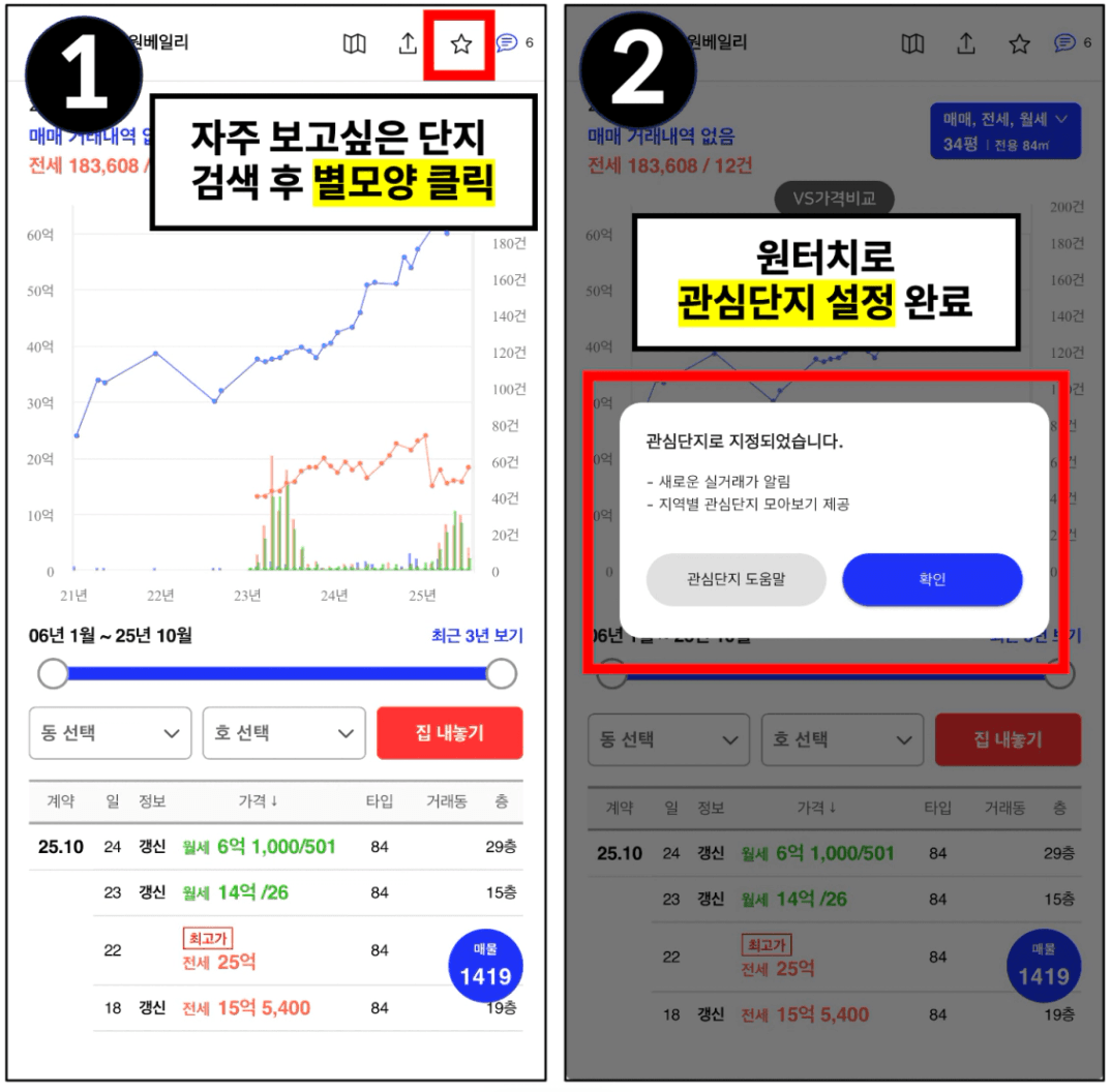 한 두번의 클릭으로 알림 및 관심 단지를 설정하고