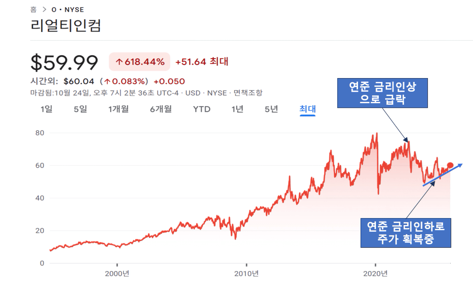 그러다가 연준의 전례없는 고금리에 타격을 받아, 주가가 49달러대까지 하락했지만, 현재 주가는 60달러로 회복하고 있습니다. 연준의 금리인하가 예상되고 있어, 리얼티인컴의 주가는 앞으로 점차 회복될거라고 봅니다.