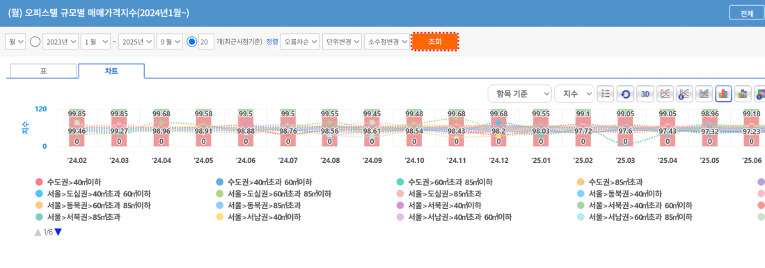 한국 부동산원에서 발표한 매매가격 지수(23년 1월- 25년 9월) 역시 거의 모든 지역에서 100을 밑돌고 있습니다. 매매 지수 100을 넘으면 가격이 상승 추세인데, 거의 모든 지역에서 가격이 약간 하락(0.1%-3%)하는 추세입니다