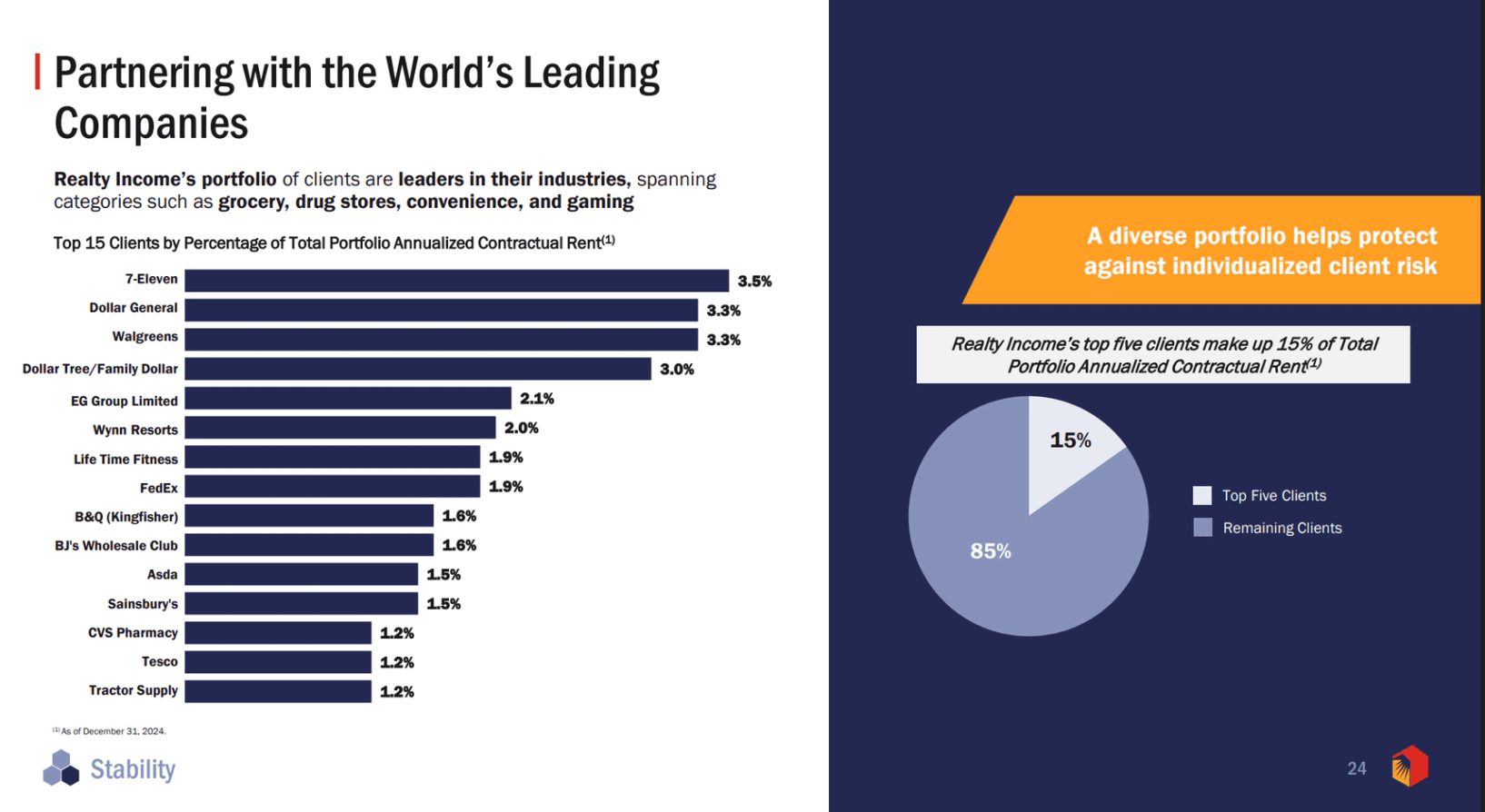 리얼티인컴은 무디스 신용 등급 A3로 안정적으로 평가받고 있습니다. 임차 기업들도 글로벌 소매기업 등이 많고, 다변화되고, 10년 이상 장기 계약이 많습니다. 즉 부동산 기업의 약점은 특정 임차인에 편중되거나 집중된 위험이 없습니다.