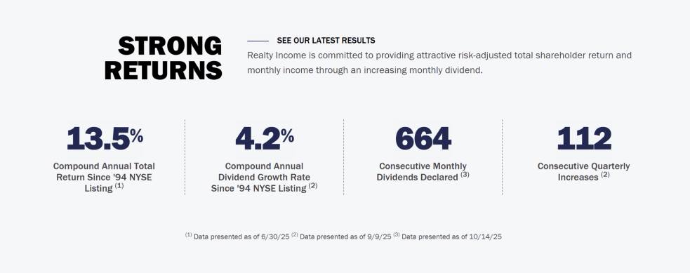 리얼티인컴은 지난 30년간 매년 복리로 배당금을 4.2%씩 늘려 왔습니다(1994년부터).  총 수익률로 생각하면 1994년부터 연간 13.5%씩 복리로 성장하는 부동산 회사입니다.