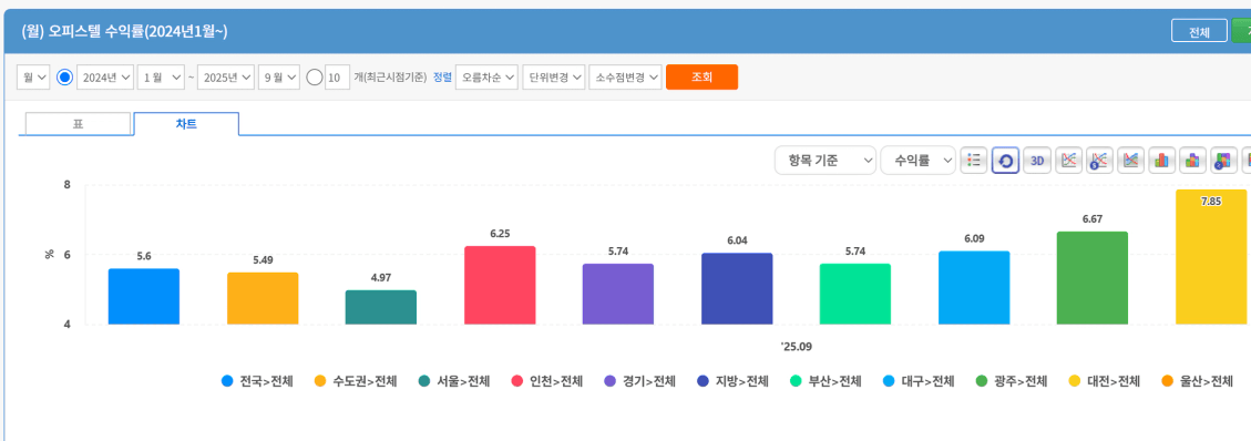 월세가 달달하긴 하지만, 오피스텔 투자 수익률은 생각보다 높지 않습니다. 한국부동산원에서 발표한 자료를 보면, 서울 오피스텔은 연 수익률이 5%(4.97%)를 넘지 못합니다(24년 1월 -25년 9월 자료).
