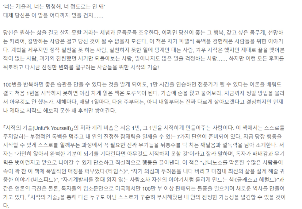 제목:시작의기술 -침대에 누워 걱정만 하는 게으른 완벽주의자를 위한 7가지 무기책 제목(책 제목 + 저자) :시술