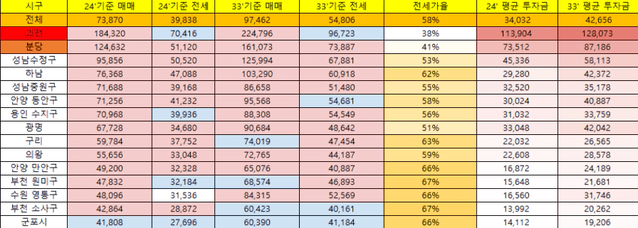 전세가도 미미하게 오르고있다. 폭이 과하진 않지만 일부지역은 전월대비 2천만원이나 오른 곳도 보인다. 이렇게 꾸준히 상승한다면 못살겠다! 기사가 나올법하다,,