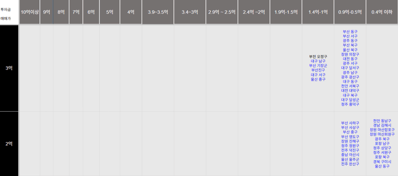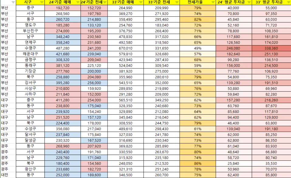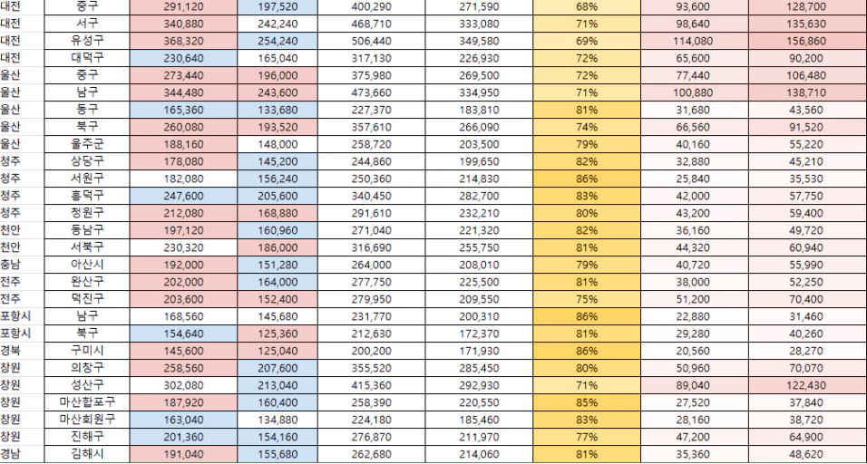 부산 대구 울산 꾸준히 오름세 / 광주는 낮은 금액으로 꾸준히 거래됨 / 확실히 대장들은 수요가 있는 듯 / 서울에 비해 여전히 지방은 싸다.