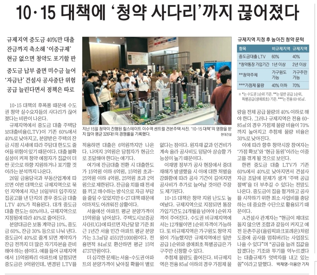 규제지역 실거주의무, 대출한도 축소 등으로 거래가 줄어든 것과 함께 청약도 기준이 까다로워졌다는 기사