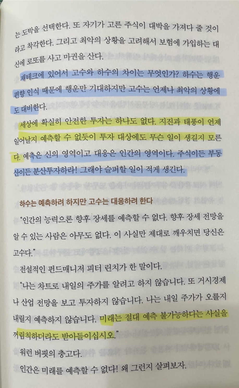p.195 재테크에 있어서 고수와 하수의 차이는 무엇인가? 하수는 행운 편향 인식 때문에 행운만 기대하지만 고수는 언제나 최악의 상황에도 대비한다. .. 예측은 신의 영역이고 대응은 인간의 영역이다.