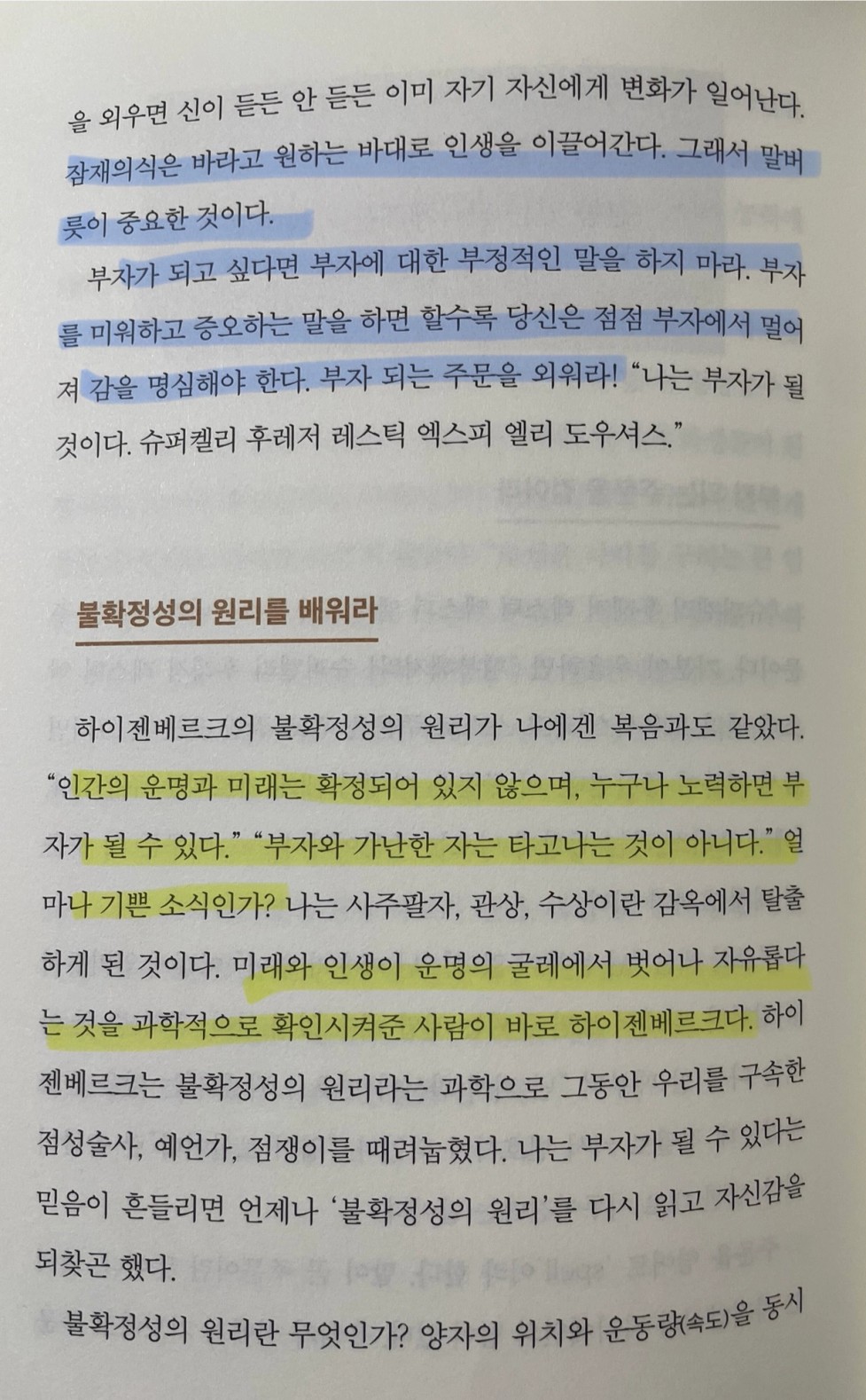 p.202 잠재의식은 바라고 원하는 바대로 인생을 이끌어간다. 그래서 말버릇이 중요한 것이다. 부자가 되고 싶다면 부자에 대한 부정적인 말을 하지 마라. 부자를 미워하고 증오하는 말을 하면 할수록 당신은 점점 부자에서 멀어져 감을 명심해야 한다. 부자 되는 주문을 외워라!