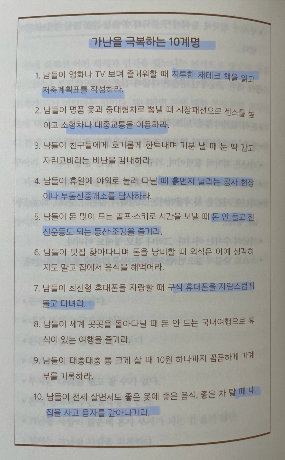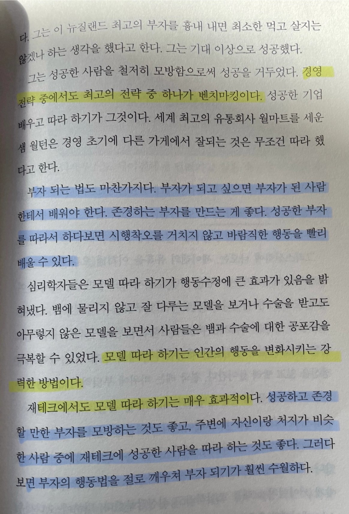 p.219 부자 되는 법도 마찬가지다. 부자가 되고 싶으면 부자가 된 사람한테서 배워야 한다. 존경하는 부자를 만드는 게 좋다. .. 성공하고 존경할 만한 부자를 모방하는 것도 좋고, 주변에 자신이랑 처지가 비슷한 사람 중에 재테크에 성공한 사람을 따라 하는 것도 좋다.