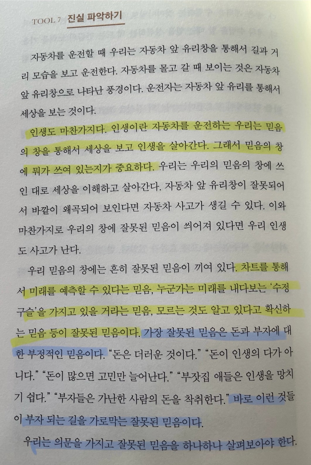 p.228 인생도 마찬가지다. 인생이란 자동차를 운전하는 우리는 믿음의 창을 통해서 세상을 보고 인생을 살아간다. 그래서 믿음의 창에 뭐가 쓰여 있는지가 중요하다. .. 가장 잘못된 믿음은 돈과 부자에 대한 부정적인 믿음이다. .. 이런 것들이 부자 되는 길을 가로막는 잘못된 믿음이다.